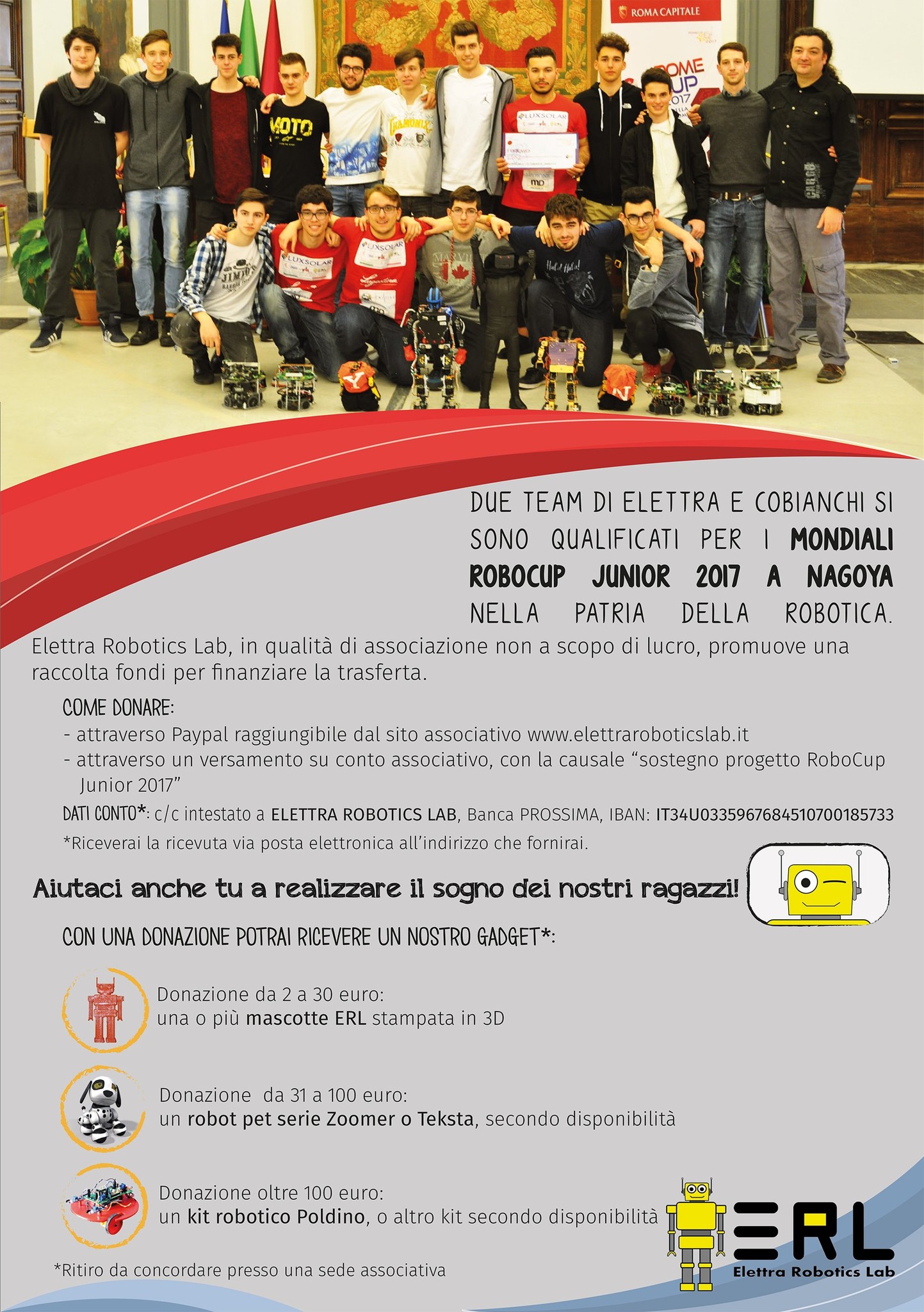 Elettra Robotics Lab fondata da un gruppo di appassionati, ha l’obbiettivo di promuovere e divulgare la robotica a scopo educativo, sociale e ludico. ERL si rivolge a tutti coloro che vogliono condividere sapere, esperienza, tecnologia, creatività progettuale e soprattutto la voglia di mettersi in gioco. Per questo ERL collabora con scuole e aziende di vari settori, partecipando a fiere, avvenimenti e manifestazioni.